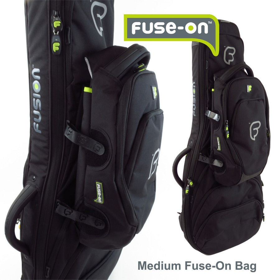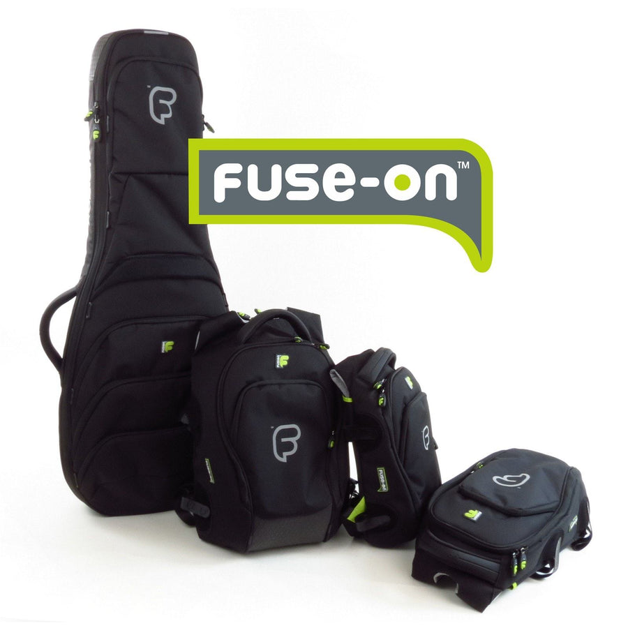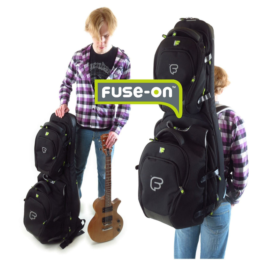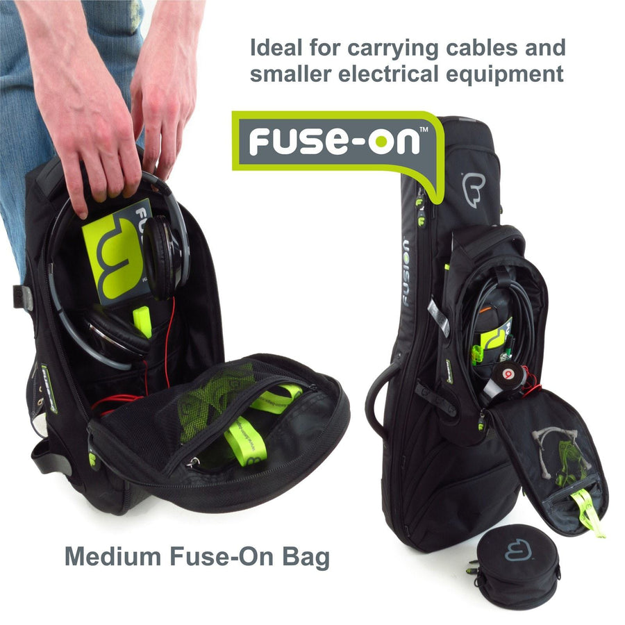 The bags are lightweight and portable and incorporate the "Fuse-On" system, allowing a separate range of accessory bags to fit quickly and easily onto the front of the guitar bag. The padded "Fuse-on" bags have been specifically designed to carry and protect laptops, electrical leads, foot pedals and a host of personal items.