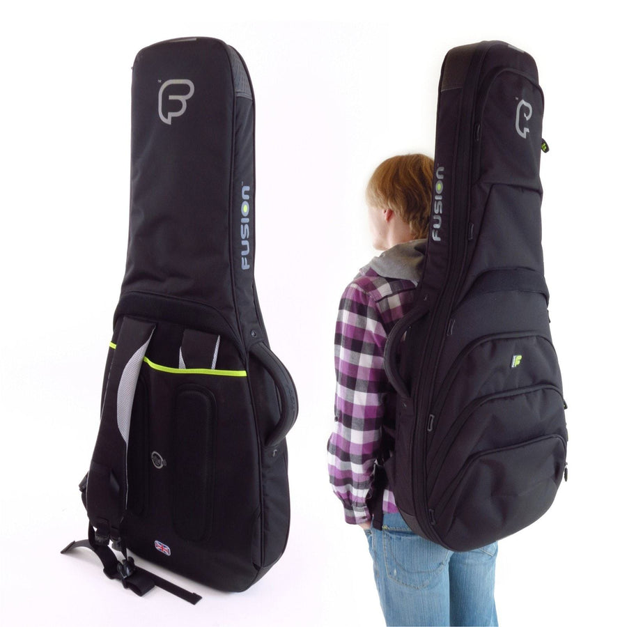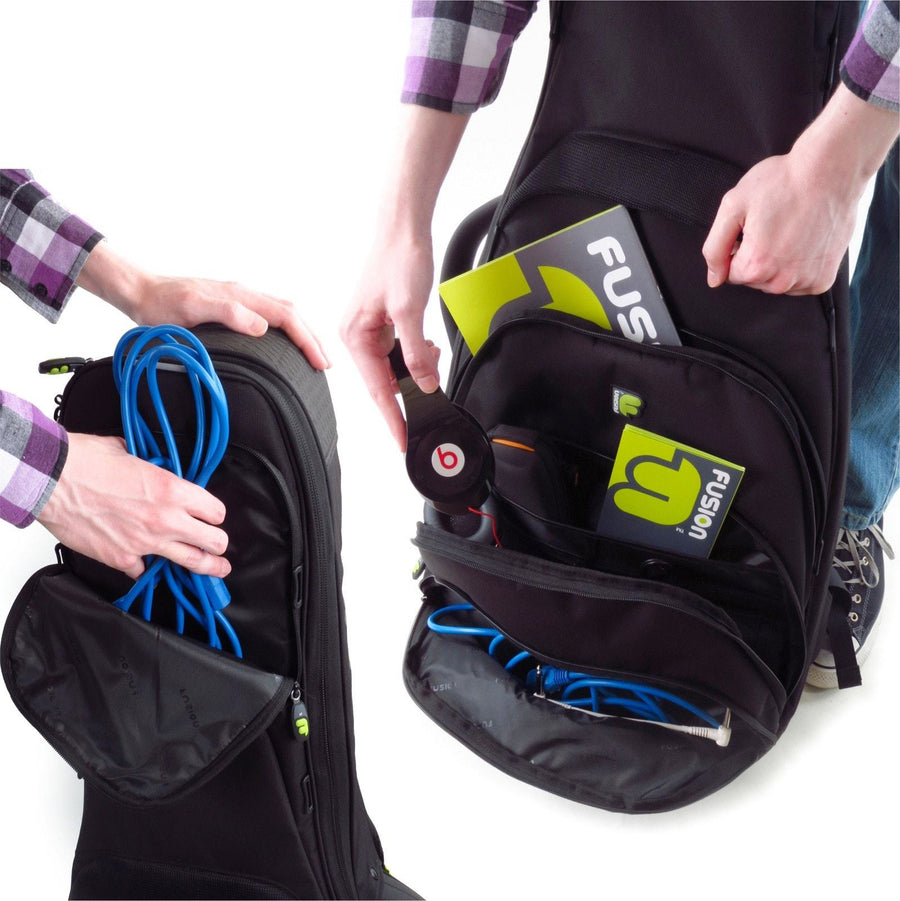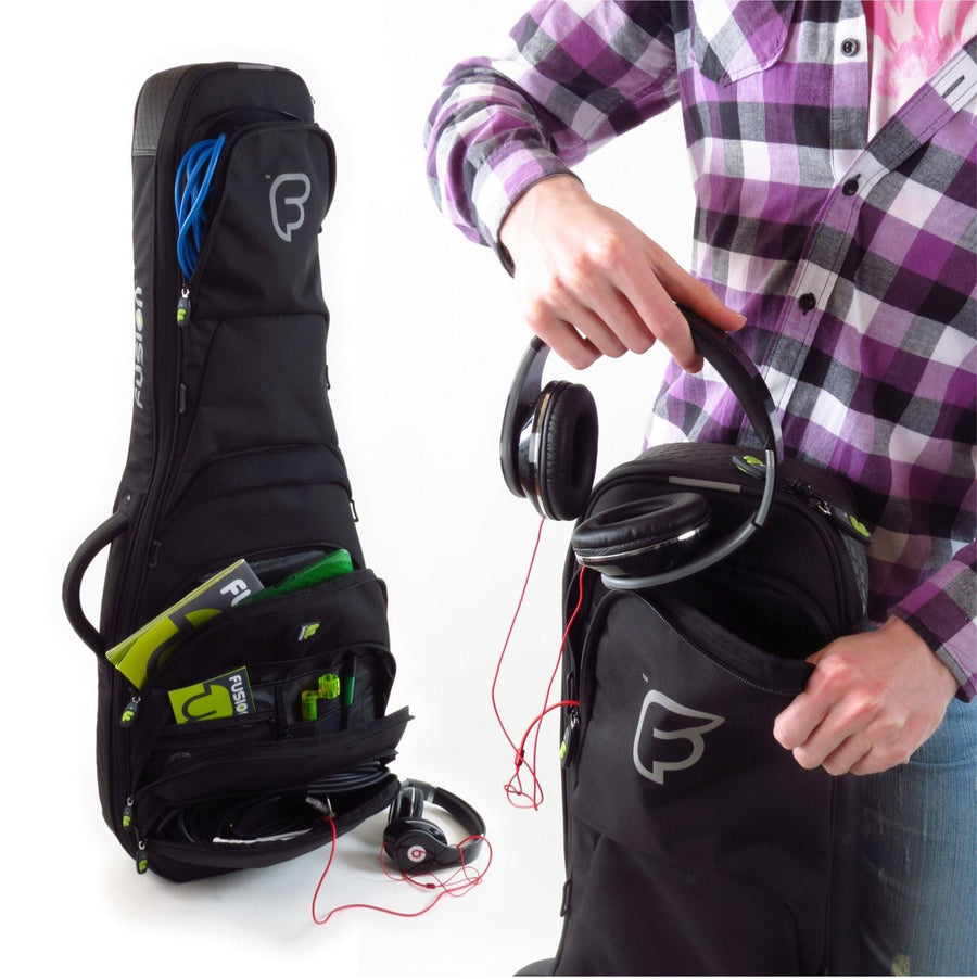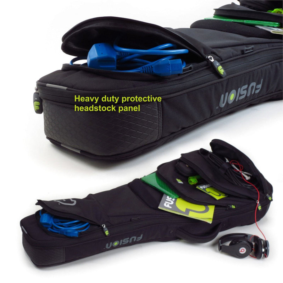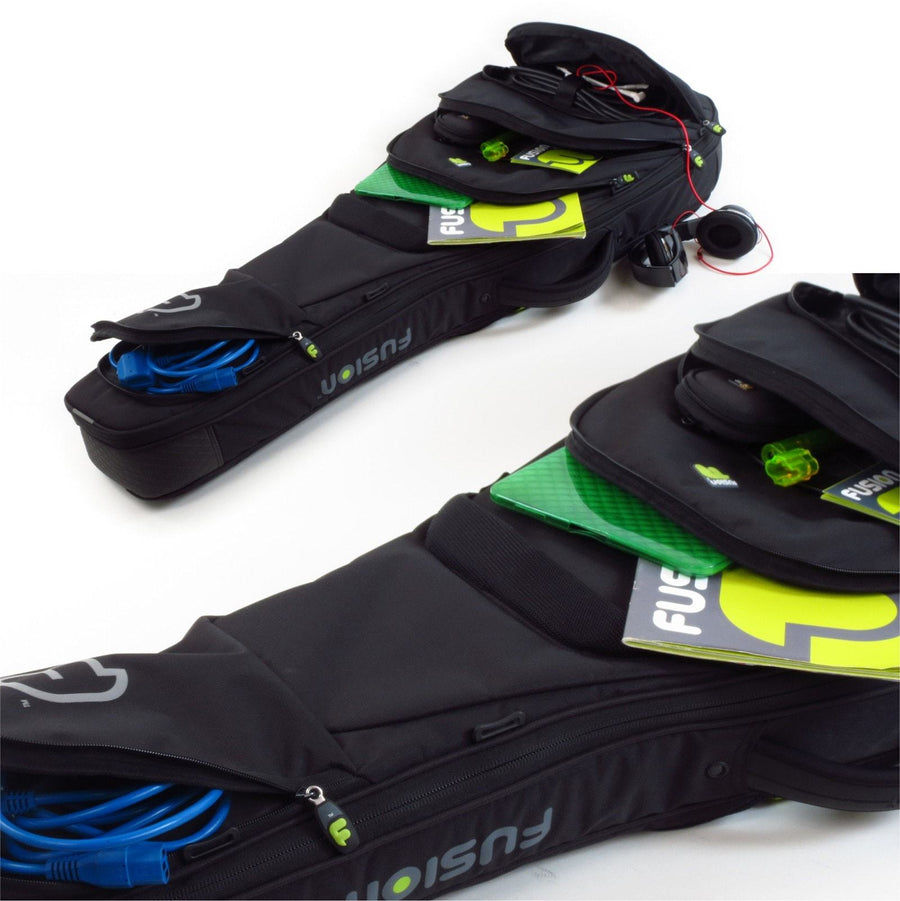The bags are lightweight and portable and incorporate the "Fuse-On" system, allowing a separate range of accessory bags to fit quickly and easily onto the front of the guitar bag. The padded "Fuse-on" bags have been specifically designed to carry and protect laptops, electrical leads, foot pedals and a host of personal items.