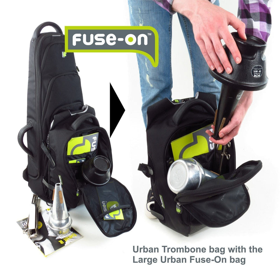 The Large "Fuse-on" bag can be attached to the base area of the Urban Guitar bag and to the front of the Urban Brass/Woodwind bags